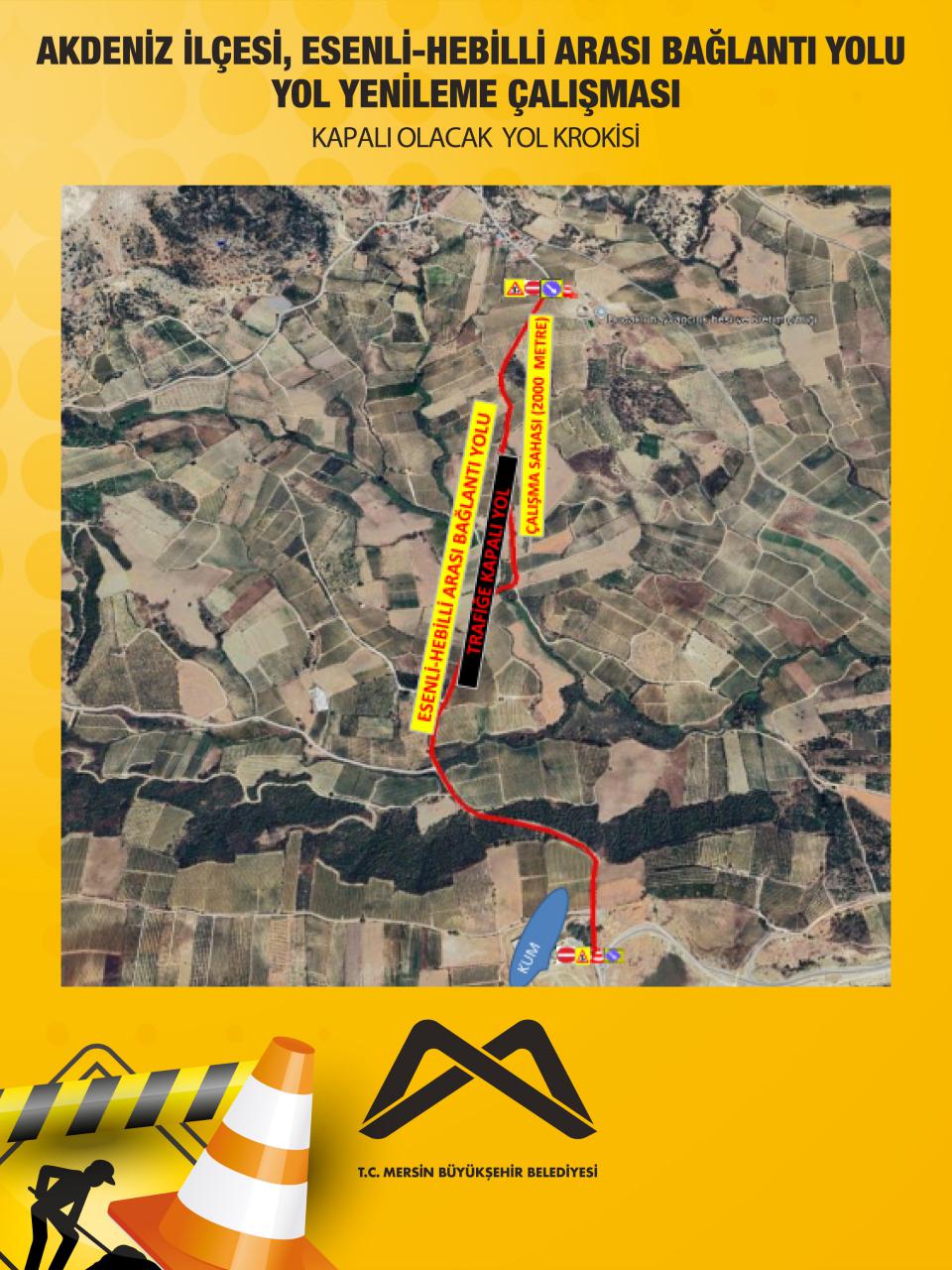 Akdeniz ilçesi, Esenli-Hebilli arası bağlantı yolunda gerçekleşecek olan yol yenileme çalışmasından dolayı krokide belirtilen alan 10.11.2025-21.11.2025 tarihleri arasında trafiğe kapalı olacaktır.