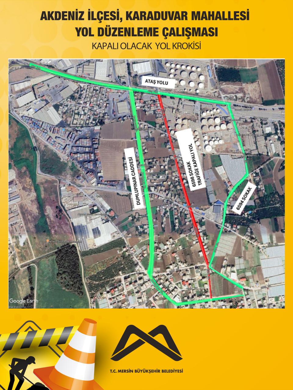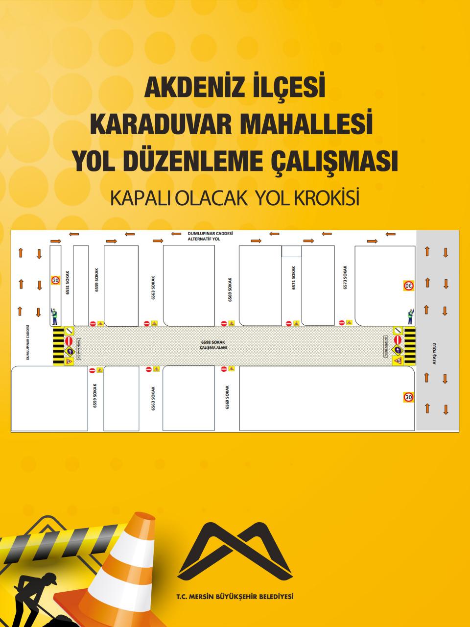 Akdeniz ilçesi, Karaduvar Mahallesi, 6598 Sokak'ta gerçekleşecek olan yol düzenleme çalışmasından dolayı krokide belirtilen alan 24.10.2025 Cuma, 10.00 itibarıyla trafiğe kapalı olacaktır.
