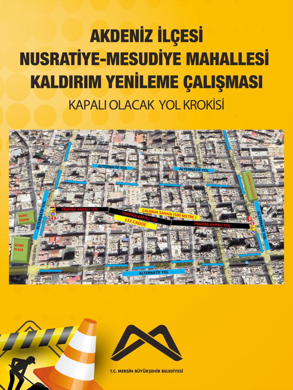 Akdeniz ilçesi, Nusratiye-Mesudiye Mahallesi, 112. Cadde'de (Çakmak Caddesi ile Kuvayi Milliye Caddesi arası) gerçekleşecek olan kaldırım yenileme çalışmasından dolayı krokide belirtilen alan 03.10.2025-10.10.2025 tarihleri arasında trafiğe kapalı olacaktır.