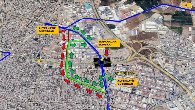 MEŞOT (Otogar) İstikametine Giden Hatlarımız İçin İzlenecek Güzergâh: Kapalı olan Hal Kavşağı'na varmadan, Hal giriş kavşağından sola U dönüşü yapacak; Göknur Durağı’ndan sağa dönüş yaparak Barış Parkı istikametinden 155. Cadde yönünden düz devam edip sağa dönecek ve oradan Turgut Özal Bulvarı’na bağlanacaktır.