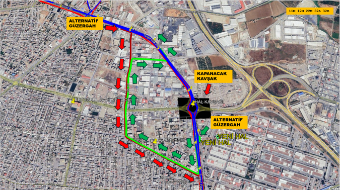 Mersin ili, Akdeniz ilçesi, Hal mevkisindeki kavşakta 29.11.2025 tarihinde başlayan kavşak çalışması nedeniyle; 11M, 12M, 22M, 32A , 32B ve 115 numaralı hatlarımızda güzergâh değişikliğine gidilmiştir.