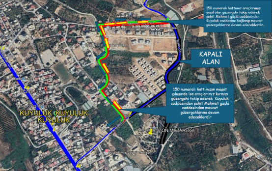 150 Numaralı hattımız Kuyuluk Caddesinden Şehit Mehmet Güçlü Caddesin mevcut güzergahlarına devam edeceklerdir.