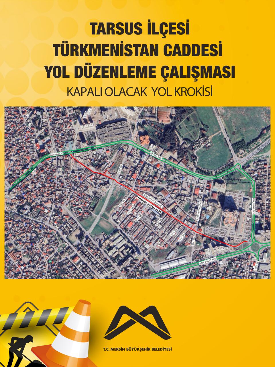 Tarsus ilçesi, Türkmenistan Caddesi'nde gerçekleşecek olan yol düzenleme çalışmasından dolayı krokide belirtilen alan 06.10.2025 Pazartesi, 09.00 itibarıyla trafiğe kapalı olacaktır.