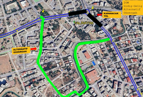 13M HATTI YEŞİL ROTA: Araçlarımız Çiftçiler Caddesi üzerinden gelirken, çalışma olan kavşağa girmeden SAĞA dönecek; Yalınayak Mezarlığı yanındaki ara yolları takip ederek Yavuz Sultan Selim Bulvarı’na bağlanacak ve seferine devam edecektir.