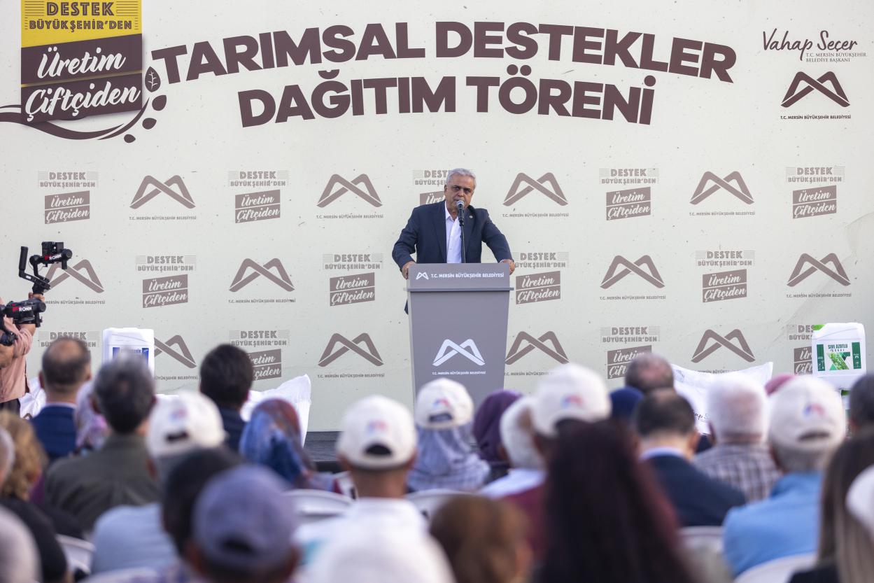 Türkiye Belediyeler Birliği (TBB) Başkan Vekili ve Mersin Büyükşehir Belediye Başkanı Vahap Seçer, Mersin Büyükşehir Belediyesi Tarımsal Hizmetler Dairesi Başkanlığı tarafından düzenlenen ‘Mısır Flake, Nergis Soğanı, Güneş Paneli ve Sıvı Gübre Dağıtım Töreni’ne katılım sağladı. Tarsus İlçesi Cumhuriyet Meydanı’nda düzenlenen tören ile Tarsus ve Çamlıyaylalı üretici ve çiftçiler; Güneş Paneli, Sıvı Gübre, Büyükbaş Hayvan Yetiştiricilerine Yem Desteği ve Nergis Soğanı Desteği olmak üzere 4 farklı proje başlığı altında verilen desteklerden faydalandı.