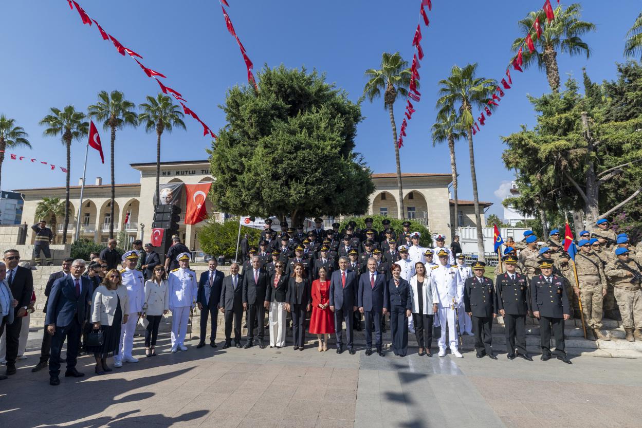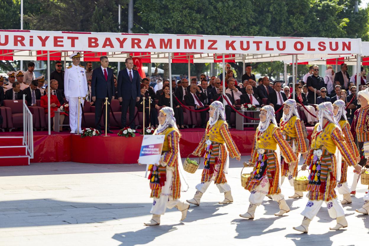 İlk olarak Kültür Merkezi Şeref Salonu’nda tebrikat töreni ile başlayan program, Cumhuriyet Meydanı’nda devam etti. Başkan Seçer, Vali Toros ve Tuğamiral Darcan’ın halkın bayramını kutlamasıyla başlayan program, saygı duruşu ve İstiklal Marşı ile devam etti. Vali Toros’un günün anlam ve önemine ilişkin konuşması ile süren programda bir öğrenci tarafından Cumhuriyet’in 102. yılı ile ilgili şiir okundu.