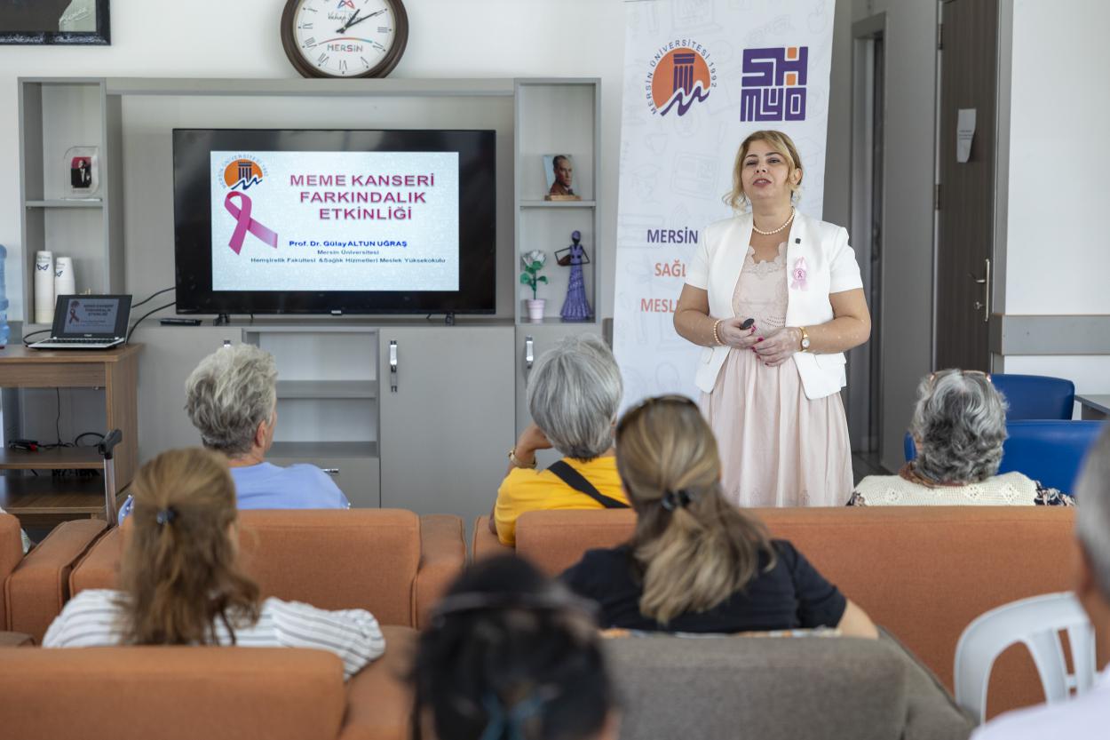 Mersin Üniversitesi Hemşirelik Fakültesi Öğretim Üyesi Profesör Doktor Gülay Altun Uğraş, meme kanserinde erken tanının önemine vurgu yaparak, “Erken tanı konulduğu zaman yaşam şansı çok yüksek olduğu için kişilere bu konuda bilgi vermeyi amaçlıyoruz. Meme kanseri bir gerçek. Bu gerçeğin farkındayız ve bunun için ne yapabiliriz konusunda çalışıyoruz. Sağlık Bakanlığımızın 40 yaş üzerindeki kadınlar için özellikle tarama programları var. Ücretsiz olarak KETEM’lerden yararlanabilecekleri programlar var. Kendi kendine meme muayenesini anlattık. Bunların hiçbirisi meme kanserini önlemiyor ama erken tanı konulmasını sağlıyor” dedi.