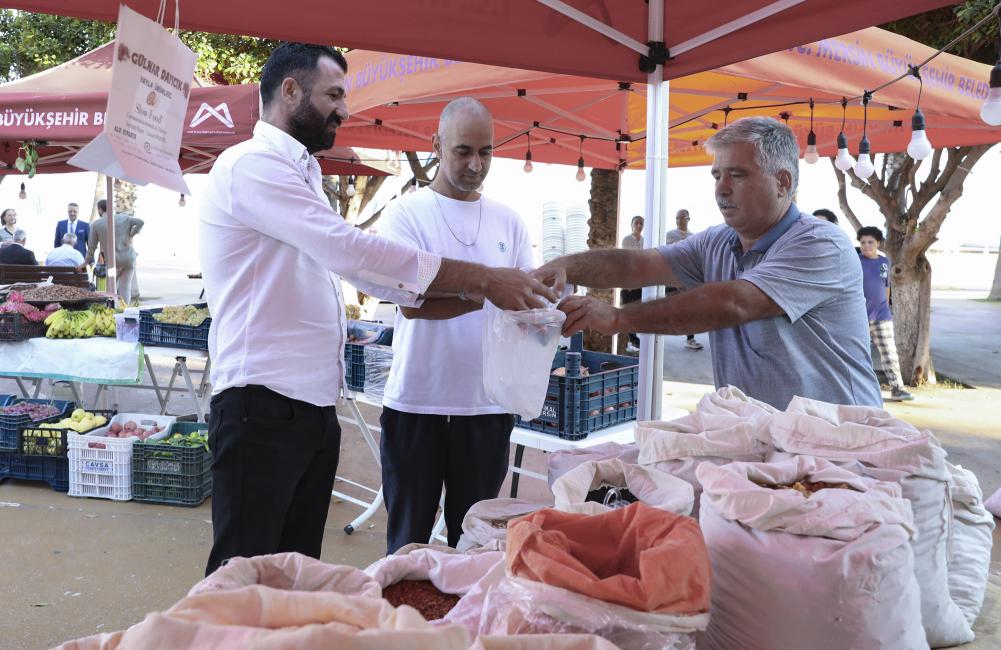 Mersin Büyükşehir Belediyesi Kadın ve Aile Hizmetleri Dairesi’nde görev yapan Burcu Sert, üretici kadınların güler yüzleriyle stant açtığını ve aylarca emek verdikleri ürünleri satışa sunduklarını anlatarak, “Hasat Pazarımız Galatasaray Meydanı’nda 19 Ekim Pazar gününe kadar açık olacak. Tüm Mersinlileri, kadın elinden üretime destek olmak için Galatasaray Meydanı’na davet ediyoruz. Vatandaşlarımız Mut’un obruk peynirinden Gülnar’ın pekmezine, kuş üzümüne, salçalardan Tarsus zeytinine kadar birçok ürünü burada bulabilir. Büyükşehir olarak kadın elinden üretimi ve dayanışmayı desteklemekten mutluluk duyuyoruz” dedi.