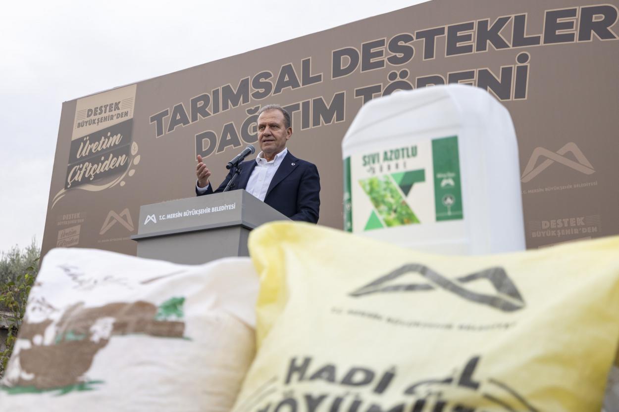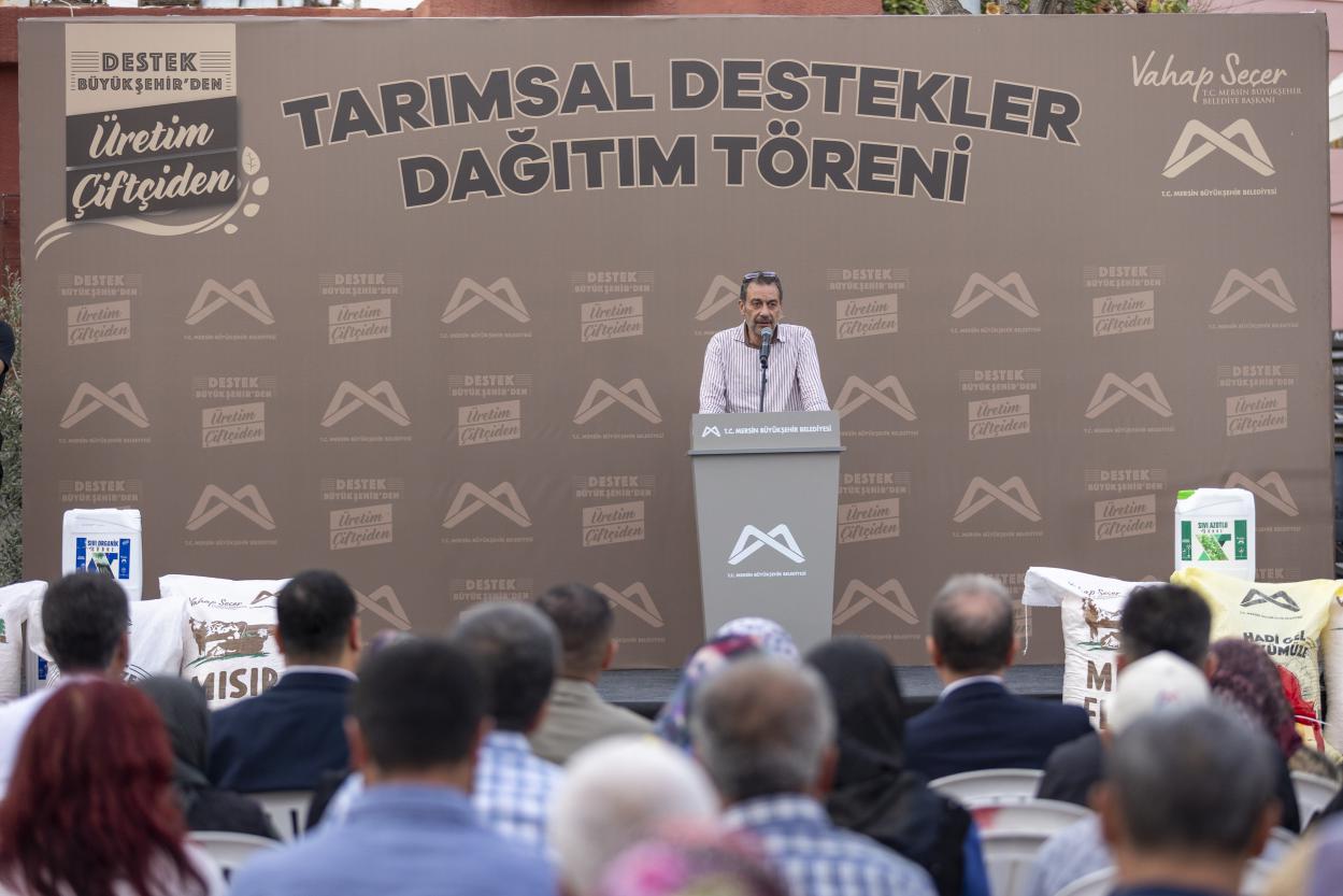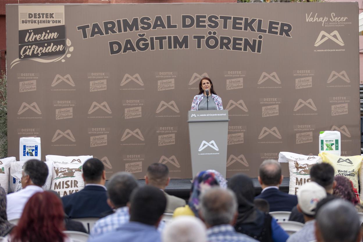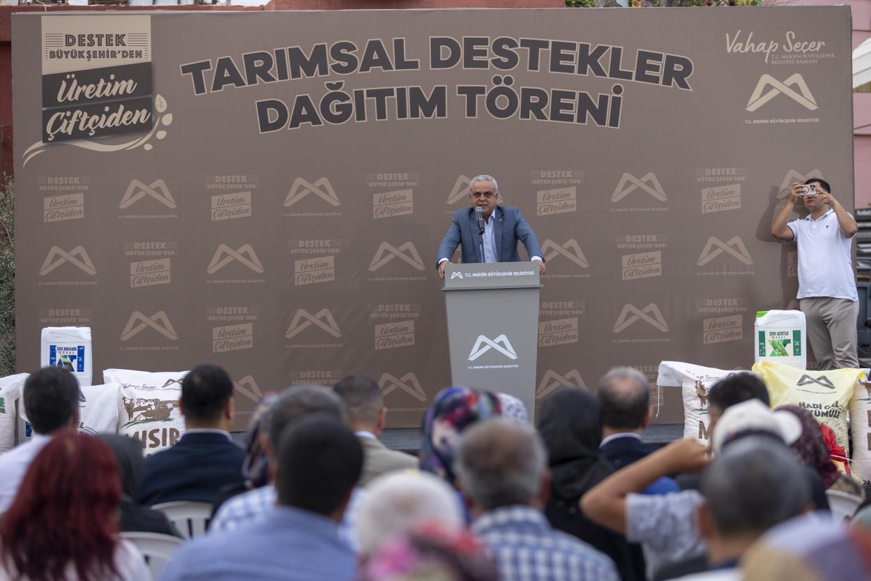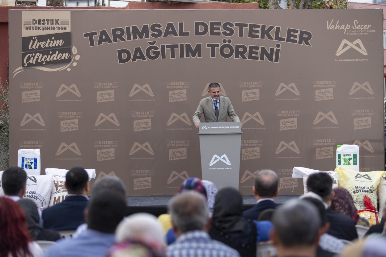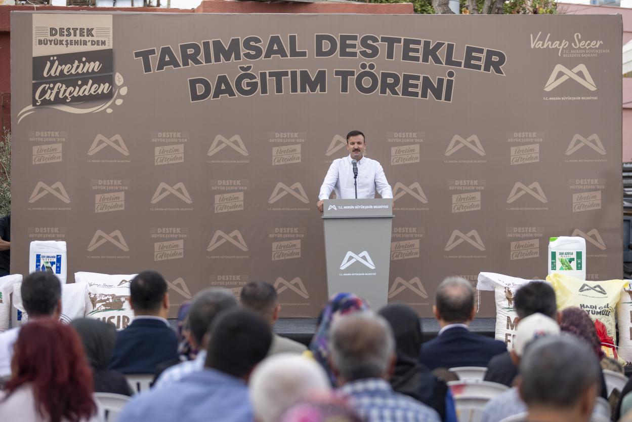 Türkiye Belediyeler Birliği (TBB) Başkan Vekili ve Mersin Büyükşehir Belediye Başkanı Vahap Seçer, Mersin Büyükşehir Belediyesi tarafından ‘Destek Büyükşehir’den Üretim Çiftçiden’ sloganı ile düzenlenen, ‘Küçükbaş Hayvan, Yem, Nergis Soğanı, Mısır Flake, Sıvı Gübre ve Güneş Paneli Dağıtım Töreni’ne katıldı. Tarımsal Hizmetler Dairesi Başkanlığı tarafından; Akdeniz, Toroslar, Yenişehir, Mezitli, Tarsus ve Çamlıyayla ilçeleri kapsamında Eski Mezitli Mahalle Muhtarlığı önünde düzenlenen törende üretimin kalbini attıran 1427 üretici ve yetiştirici, Büyükşehir’in sağlamış olduğu tarımsal desteklerden faydalandı.