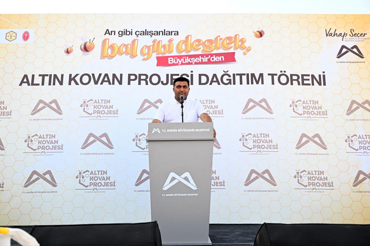 Mersin İli Arı Yetiştiricileri Birliği Başkanı Adem Kurt, Mersin’in Türkiye’de arıcılıkta ilk 5’lerde olduğunu söyledi. Mersin’de üretilen balları tüm dünyaya tanıtmak istediklerini sözlerine ekleyen Kurt, Büyükşehir Belediyesi’nin desteklerinin önemli olduğunu vurgulayarak, “Mersinli üreticilerimizin ürettiği balları önce Mersin’e sonra Türkiye’ye sonra bütün dünyaya tanıtacağız. Üreticilerimizin emeği olan ballar hak ettiği değeri ve fiyatı bulacak, yüzümüz daha da gülecek. Desteğiniz bizim için paha biçilemez Vahap Başkanım” dedi. Programda ayrıca; CHP Mersin Milletvekili Hasan Ufuk Çakır, Erdemli Ziraat Odası Başkanı Rasim Şahin, Altın Kovan Projesi desteğinden yararlanan Münevver Doğan Yiğit ile Erdemli İlçesi Karahıdırlı Mahalle Muhtarı Ömer Çolak da birer konuşma yaptı. Konuşmaların ardından projeden faydalanan arı yetiştiricilerine temsili olarak kovanları takdim edildi. Tören, toplu fotoğraf çekimi ile sona erdi.