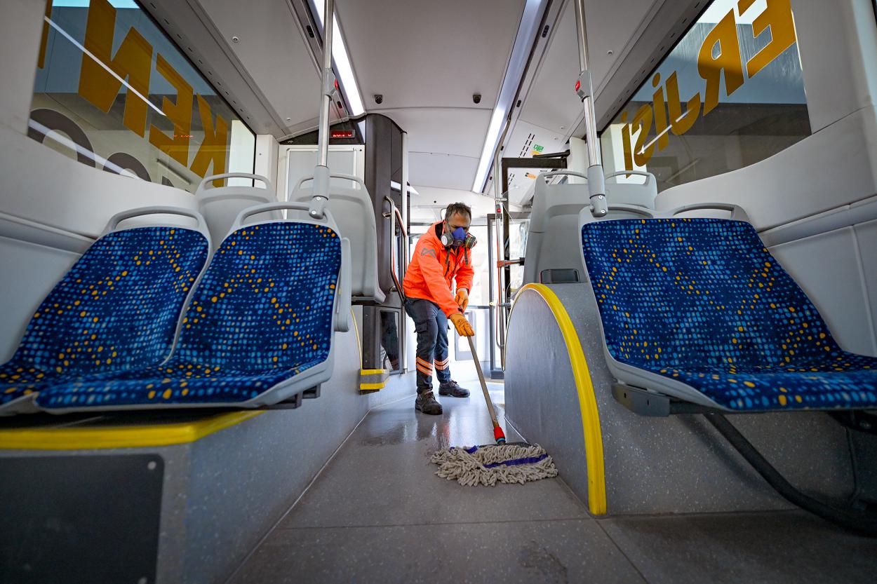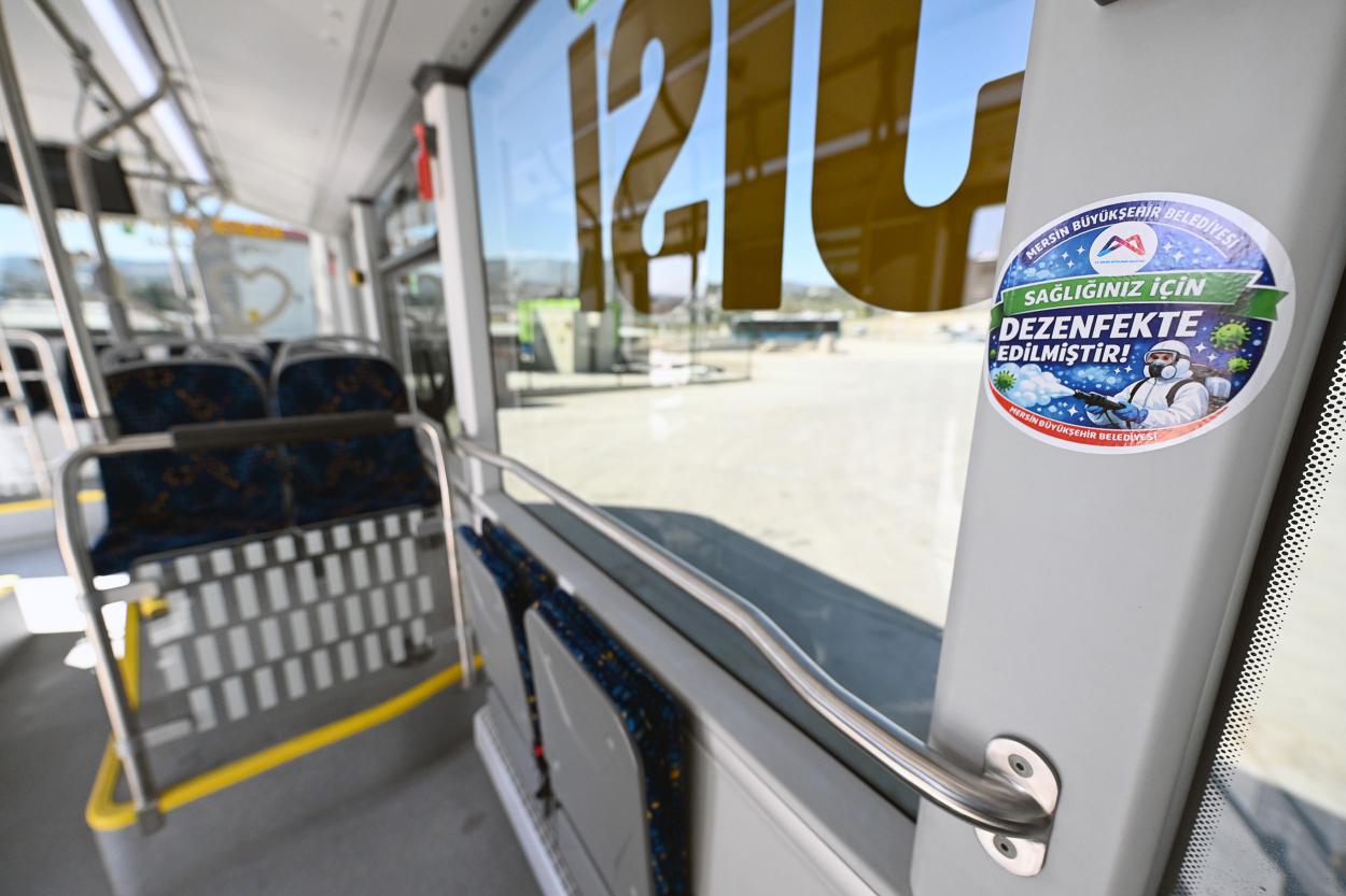 Mersin Büyükşehir, toplu taşımanın kalabalık nüfusların bir arada bulunduğu alanlar olması nedeniyle hijyen ve güvenlik konularına büyük önem veriyor. Bu kapsamda; sabah saat 06.00’dan gece 02.00’ye kadar hizmet veren toplu taşıma araçları, sefer öncesinde kapsamlı bir temizlik ve dezenfekte sürecinden geçiyor. Otobüsler sefere çıkmadan önce Büyükşehir’in Toplu Taşıma Yerleşkesi’nde bulunan yıkama bölümünde dış yıkamadan geçiriliyor. Ardından araçların iç kısmında; koltuklar, tutunma barları ve yolcuların temas ettiği tüm yüzeyler titizlikle siliniyor. Temizlik işlemlerinin ardından T.C. Sağlık Bakanlığı onaylı biyosidal ürünlerle araçların tamamında dezenfeksiyon çalışması yapılıyor. Mersin Büyükşehir böylece, toplu taşıma araçlarında oluşabilecek salgın ve bulaşıcı hastalık riskini en aza indirmeyi hedefliyor.