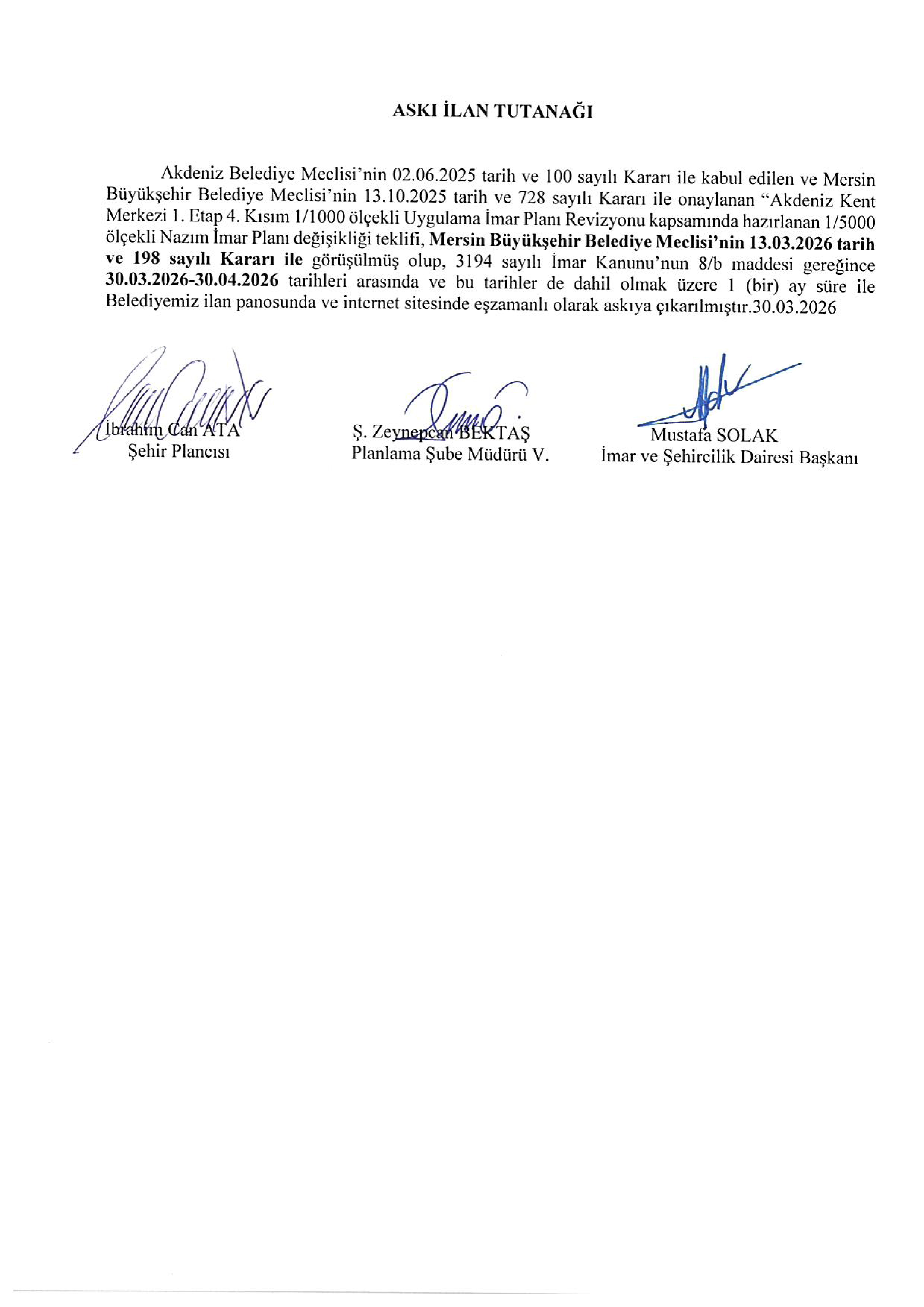 Akdeniz Kent Merkezi 1. Etap 4. Kısım 1/1000 ölçekli Uygulama İmar Planı Revizyonu kapsamında hazırlanan 1/5000 ölçekli Nazım İmar Planı değişikliği teklifi