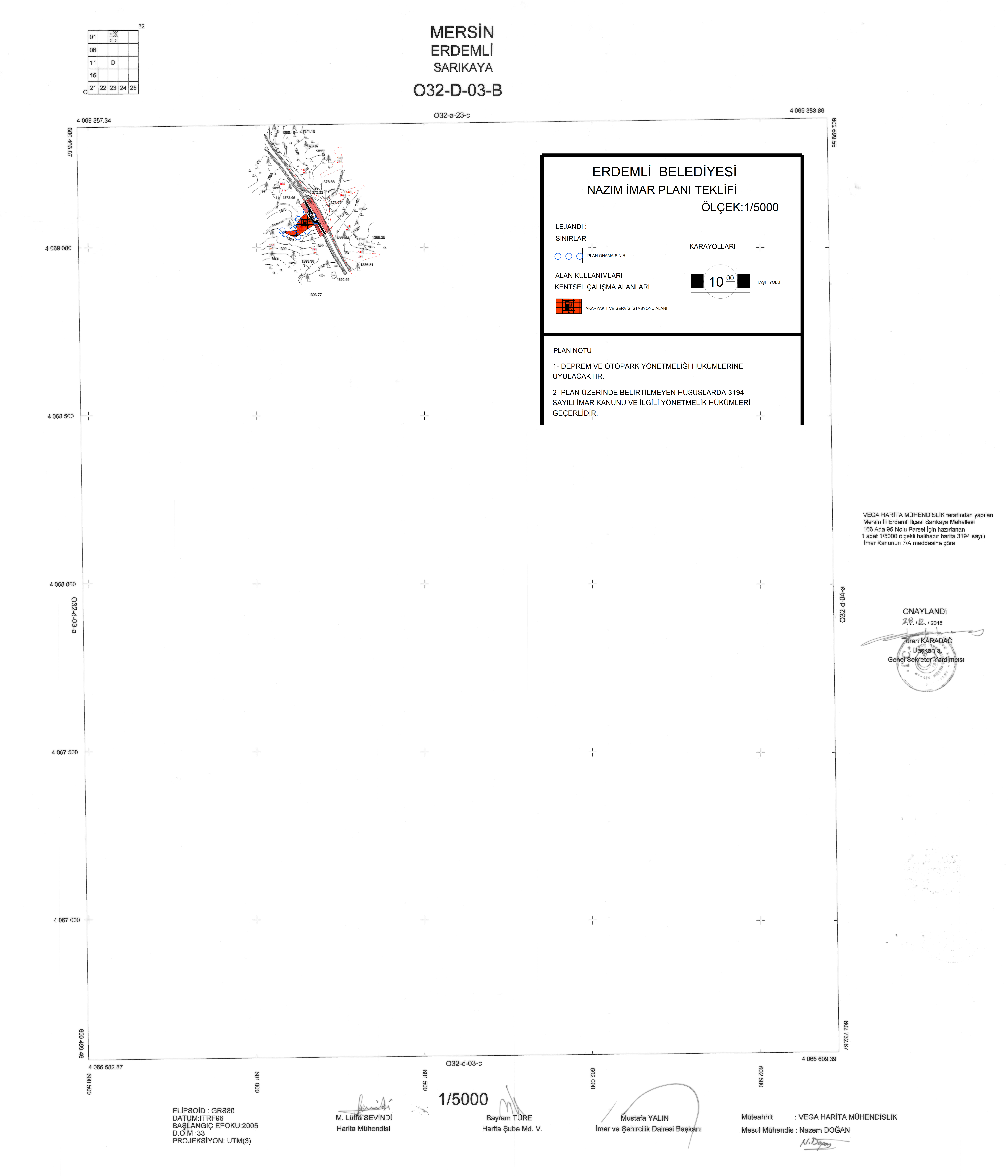 Mersin ili, Erdemli ilçesi, Sarıkaya mahallesi, 166 ada 95 parselde Akaryakıt ve Servis Alanı yapılmasına ilişkin 1/5000 ölçekli Nazım İmar Planı teklifi