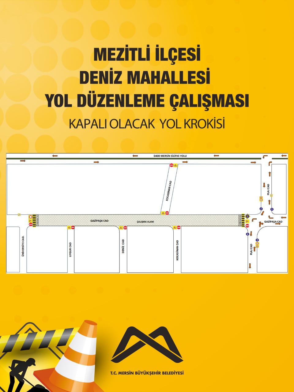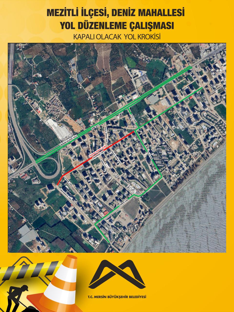 Mezitli ilçesi, Deniz Mahallesi, Gazipaşa Caddesi'nde gerçekleşecek olan yol düzenleme çalışmasından dolayı krokide belirtilen alan 20.10.2025 Pazartesi, 10.00 itibarıyla trafiğe kapalı olacaktır.