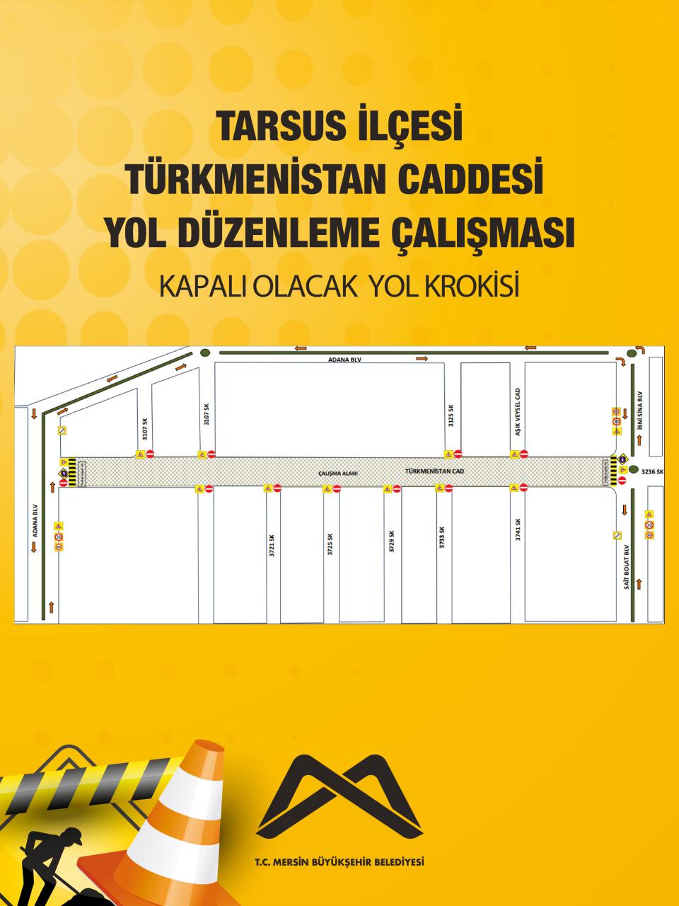 Tarsus ilçesi, Türkmenistan Caddesi'nde gerçekleşecek olan yol düzenleme çalışmasından dolayı krokide belirtilen alan 06.10.2025 Pazartesi, 09.00 itibarıyla trafiğe kapalı olacaktır.