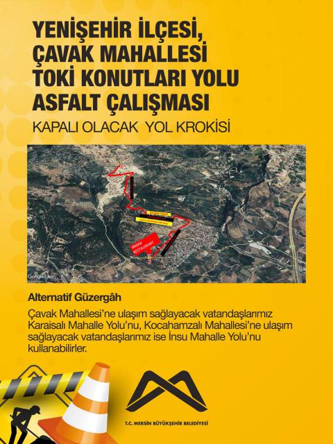 Yenişehir İlçesi, Çavak Mahallesi TOKİ Konutları yolunda asfalt çalışması yapılacağından dolayı krokide belirtilen alan 14.04.2026 Salı gününden itibaren kontrollü ve yönlendirmeli şekilde trafiğe kapalı olacaktır.