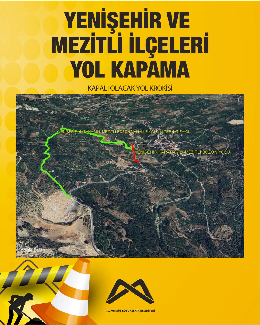 Yenişehir ilçesi Karahacılı Mahallesi ile Mezitli ilçesi Bozön Mahallesi arasındaki bağlantı yolu, bölgede meydana gelen heyelan nedeniyle geçici olarak ulaşıma kapatılmıştır.