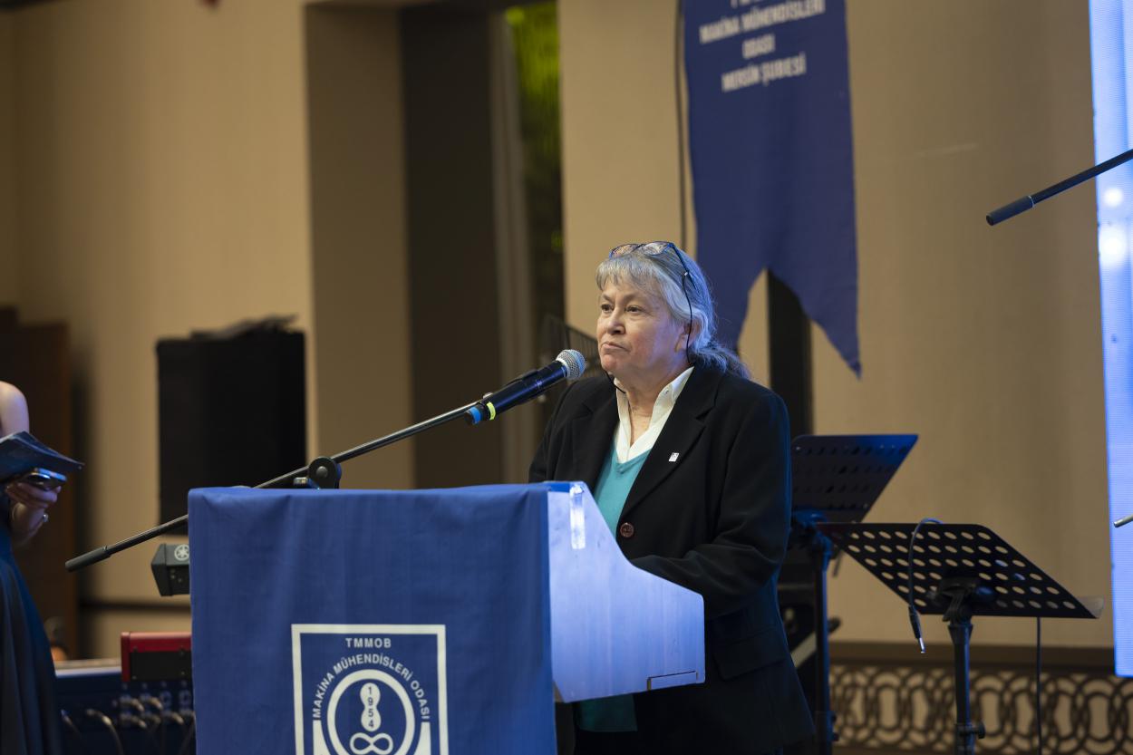 MMO Yönetim Kurulu Sekreteri Elif Öztürk, ülkedeki sorunların meslek gruplarına etki ettiğini ve bu sorunlar için mücadele verdiklerini ifade ederek, “Hiç tartışmasız ülke olarak zor günlerden geçiyoruz. Biz mühendisler olarak sorunların üstünü örtmeyiz, meslek grubu olarak bu sorunlardan nasibimizi alıyoruz. İnatla ve umutla hep birlikte bu ülkeyi daha güzel günlere götüreceğiz. Bunun için hep birlikte mücadele edeceğiz, çünkü mühendisler eğitimleri gereği sadece şikayet etmezler çözüm üretirler ve her şeyin daha iyi çalışması için uğraşırlar. Bugün, mesleğe uzun yıllarını vermiş üyeler plaketlerini alacaklar ama biz her zaman yanlarımızda olmasını temenni ediyoruz” şeklinde konuştu.