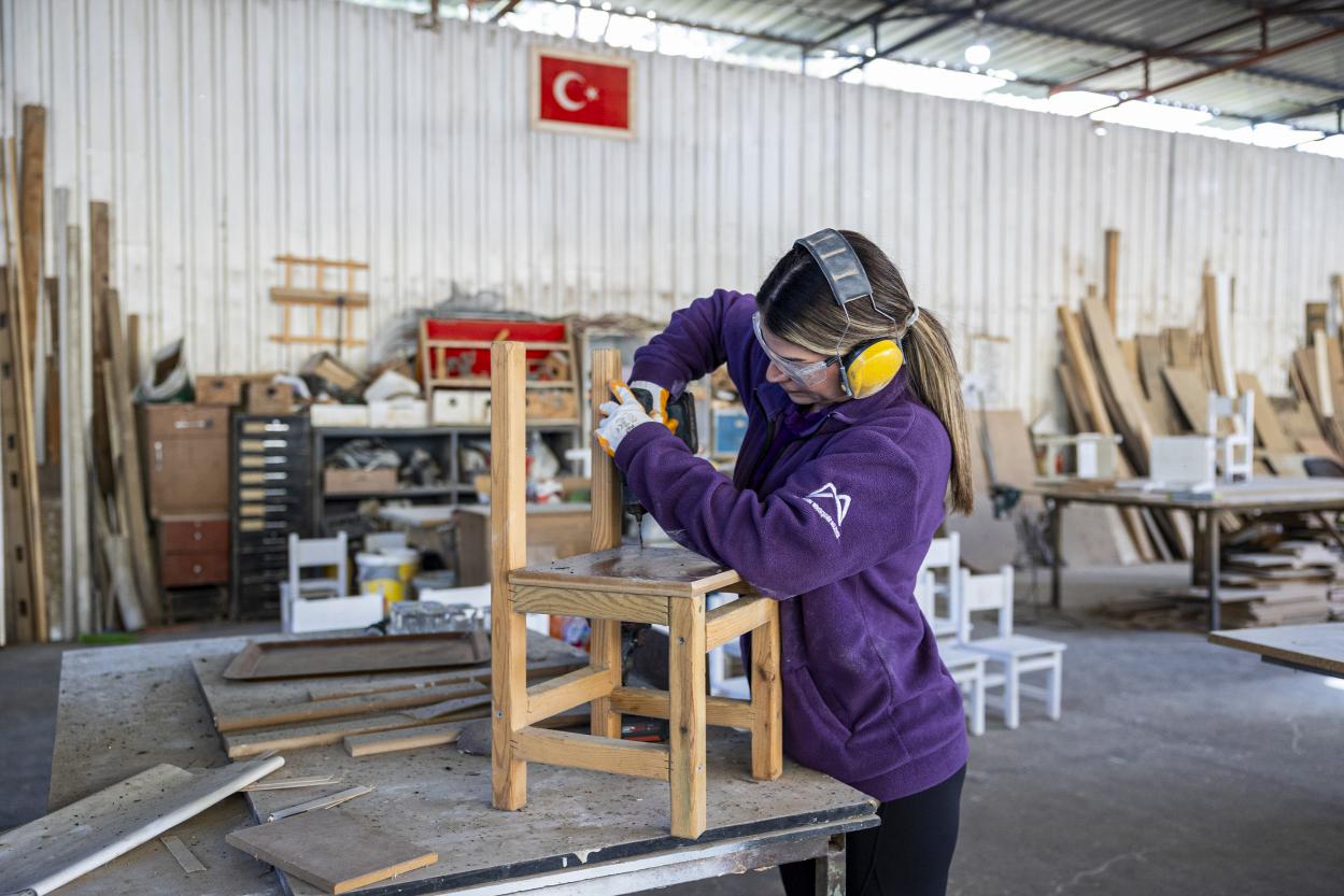 Mersin Büyükşehir Belediyesi Kadın ve Aile Hizmetleri Dairesi Başkanlığı’nda görev yapan Marangoz Ustası Teslime Özdemir, Tarsus Gençlik Kampı Geri Dönüşüm Atölyesi’nde 2020’den bu yana, birimlerin malzemelerini ürettiklerini anlatarak, “Birimlerimizden gelen ürünlerin bakım, onlarım ve tamir işlerini bu atölyede yapıyoruz. Geri Dönüşüm Atölyemizde; birimlerimizin ihtiyacı olan masa, sandalye, dolap ve büro malzemelerinden tutun, akla gelecek her türlü ihtiyacı üretiyoruz. 2020’den 2025 yılına kadar Daire Başkanlığımıza bağlı 40 birim açıldı. Bu birimlerden 38’inin malzemeleri burada üretildi. Diğer dairelerden gelen talepleri de elimizden geldiğince yerine getirmeye çalışıyoruz” ifadelerini kullandı.