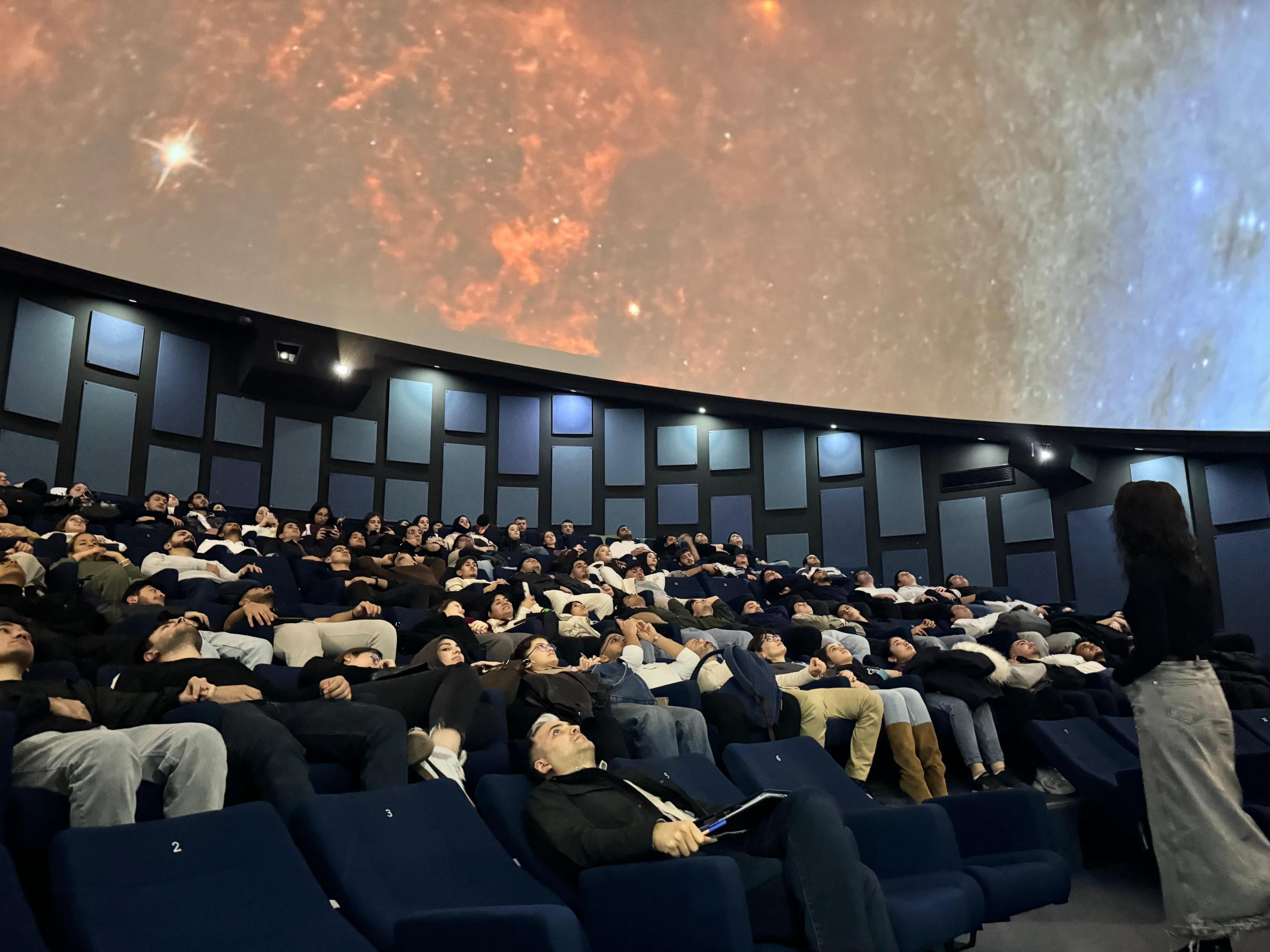 Düzenlenen bir diğer seminerde ise Astronom Merve Oylum, ‘Multidisipliner Bir Alan: Uzay’ başlıklı sunumuyla öğrencilerle buluştu. Oylum, uzay çalışmalarının birçok farklı disiplinin iş birliğiyle yürütüldüğüne dikkat çekerek, öğrencilerin kendi bölümleri ile astronomi arasında bağ kurmalarını sağladı. Seminerde uzay teknolojilerine yönelik farkındalık artırılırken, farklı disiplinlerin ortak çalışmasının önemi vurgulandı. Program kapsamında son olarak öğrenciler, planetaryum gösterimiyle uzay ve evren konularında görsel bir deneyim yaşadı.