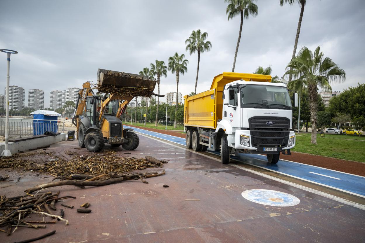 Büyükşehir Belediyesi Park ve Bahçeler Dairesi Başkanlığı ise, Adnan Menderes Bulvarı Kültür Park ve çevresinde, taşkın sonrası yüzey akıntısı ile denize ulaşan atıkların temizliğini sürdürüyor. Kayalıklardan toplanan atıklar iş makinaları aracılığıyla taşınırken, tazyikli su ile yürüyüş alanlarının temizliği de sağlanıyor. Temizlik çalışmaları sırasında atıklar arasında mahsur kalan canlılar ise kurtarılarak, doğal yaşam alanlarına sevk ediliyor. Çalışmalar kapsamında sahillerde, taşkın sularının denize taşıdığı kütük, ağaç ve çalılardan oluşan yaklaşık 150 kamyon dolusu atık temizlendi. 8 kilometrelik sahil bandında süren çalışmaların kısa süre içinde tamamlanması hedefleniyor. Kuvvetli yağışlar nedeniyle tahrip olan parklarda ise yenileme çalışmaları devam ediyor.