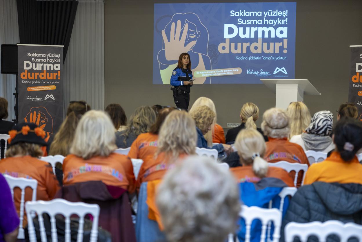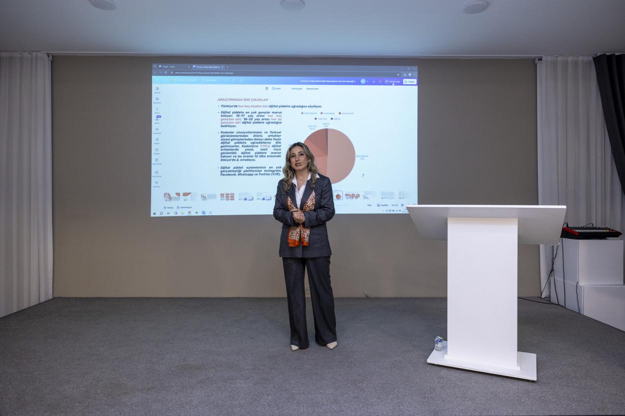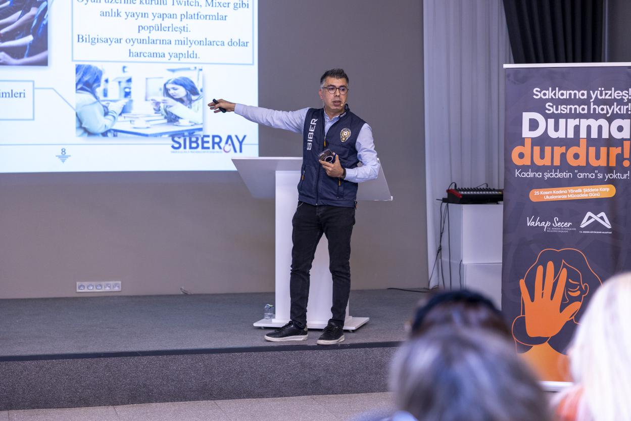 Yürüyüşün ardından Etkinlik ve Nikah Salonu’nda, alanında uzman isimlerin katılımıyla bilgilendirici sunum ve söyleşiler gerçekleştirildi. Büyükşehir Belediyesi Kadın Danışma Merkezi’nde görev yapan Klinik Psikolog İrem Öz; kadına yönelik şiddetin psikolojik etkilerini anlatarak, şiddetin kadınların ruh sağlığında bıraktığı travmatik izlere dikkat çekti. Avukat Berna Bozdağ dijital şiddetin hukuki sürecini aktarırken, sosyal medya üzerinden yapılan tehdit, taciz, özel görüntülerin izinsiz paylaşımı, ısrarlı takip gibi eylemlerin Türk Ceza Kanunu’ndaki karşılıklarını açıklayarak, hangi davranışların doğrudan suç teşkil ettiğini katılımcılarla paylaştı.