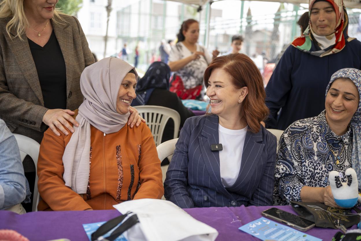 Müfide İlhan Mahallesi’nde gerçekleştirilen atölye çalışmasıyla 50’nci mahalleye ulaştıklarını belirten ve atölyeye katılan kadınlardan gelen olumlu dönüşlerin kendileri için de bir motivasyon kaynağı olduğunu dile getiren Meral Seçer, “Burada sadece üretim ve dayanışma yok. Aynı zamanda birçok bilgilendirme de yapılıyor. Bu projede en çok kıymet verdiğimiz şeylerden biri de yaşanabilir dünya için farkındalık çalışmalarının yapılması ve bununla ilgili eğitimler verilmesi. Bunlardan biri de su tasarrufu. Şu anda yaptığımız oyuncaklar da aslında bir geri dönüşüm. Satışa sunulamayan çoraplar ve tekstil atıklarından oluşan elyaflar, geri dönüşümle oyuncağa çevriliyor. Aslında dünyaya da katkı sunuyorsunuz” diye konuştu.