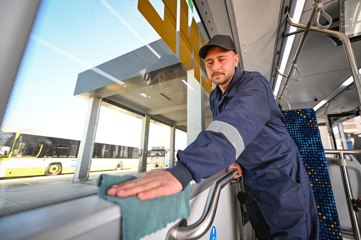 Mersin Büyükşehir Belediyesi ekipleri, toplu taşıma araçlarının gün boyunca güvenli şekilde hizmet verebilmesi için çalışmalarını aralıksız sürdürüyor. Mersin Büyükşehir Belediyesi Ulaşım Hizmetleri Dairesi Başkanlığı, toplu taşıma araçlarında hem yolcu konforunu hem de hijyen koşullarını en üst seviyede tutmak için kapsamlı bir hazırlık süreci yürütüyor. Günün ilk ışıklarından gece saatlerine kadar hizmet veren otobüsler, sefere çıkmadan önce birçok aşamadan geçirilerek vatandaşların, güvenli ve steril koşullarda yolculuk yapması sağlanıyor.