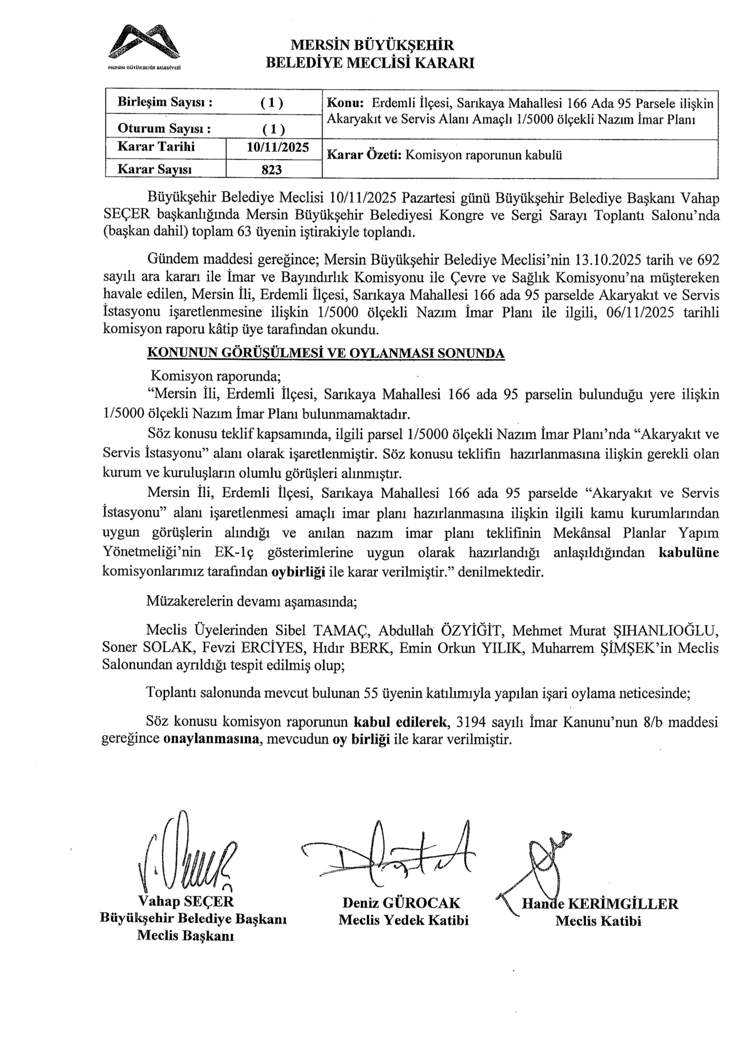 Mersin ili, Erdemli ilçesi, Sarıkaya mahallesi, 166 ada 95 parselde Akaryakıt ve Servis Alanı yapılmasına ilişkin 1/5000 ölçekli Nazım İmar Planı teklifi