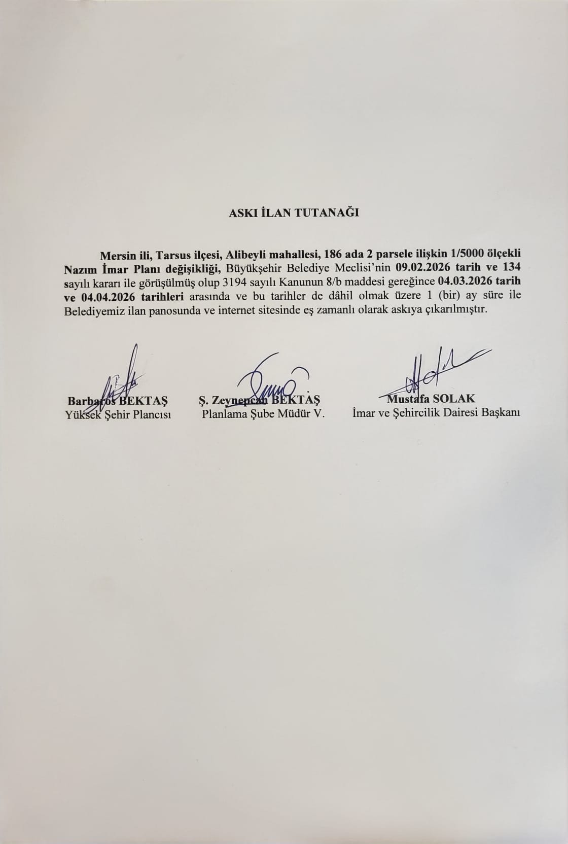 Mersin ili, Tarsus ilçesi, Alibeyli mahallesi, 186 ada 2 parsele ilişkin 1/5000 ölçekli Nazım İmar Planı değişikliği