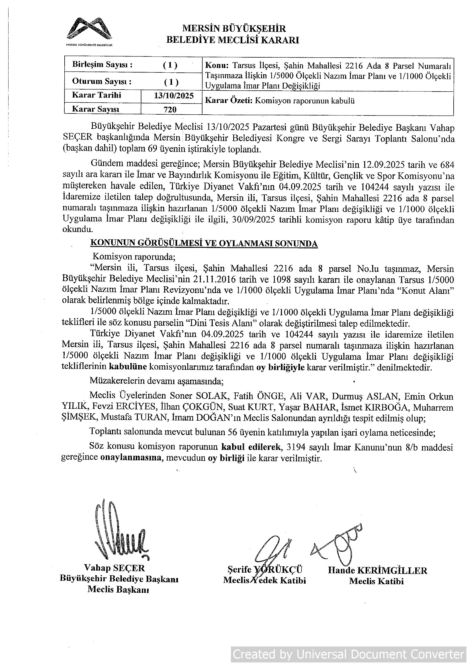 Yenişehir İlçesi, Menteş Mahallesi, 13008 ada 3 parsel numaralı taşınmaza ilişkin 1/5000 ölçekli Nazım İmar Planı değişikliği teklifi itiraz Değerlendirme